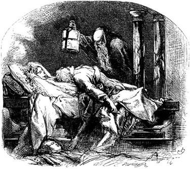 他带了花来散在他夫人的坟上,他叫我站得远远的,我就听他的话;不一会儿工夫,来了一个拿着火把的人把坟墓打开了。后来我的主人就拔剑跟他打了起来,我就奔去叫巡丁。